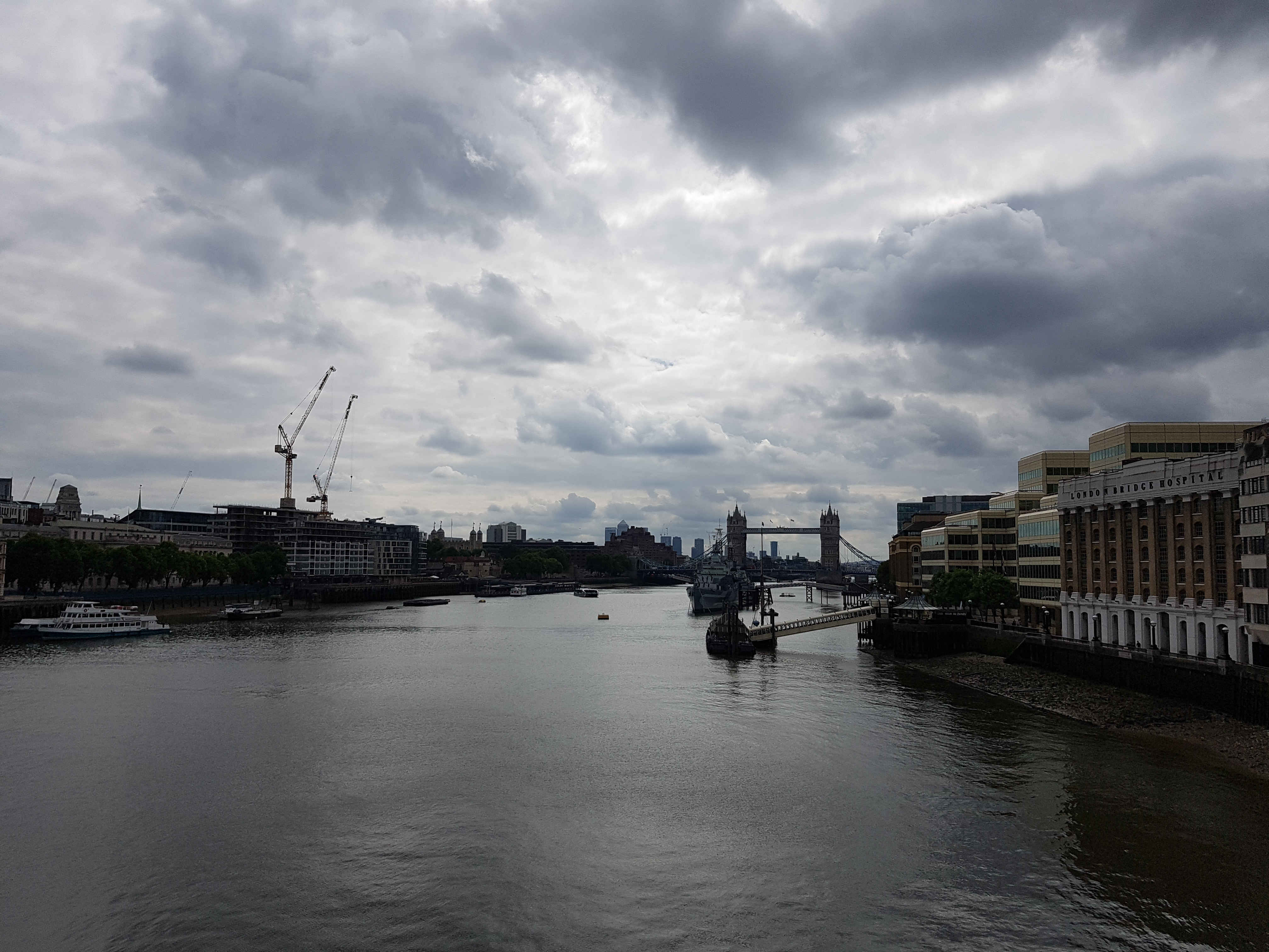 The view from Butler’s Wharf looking back upstream of the Thames towards Tower Bridge and the City of London