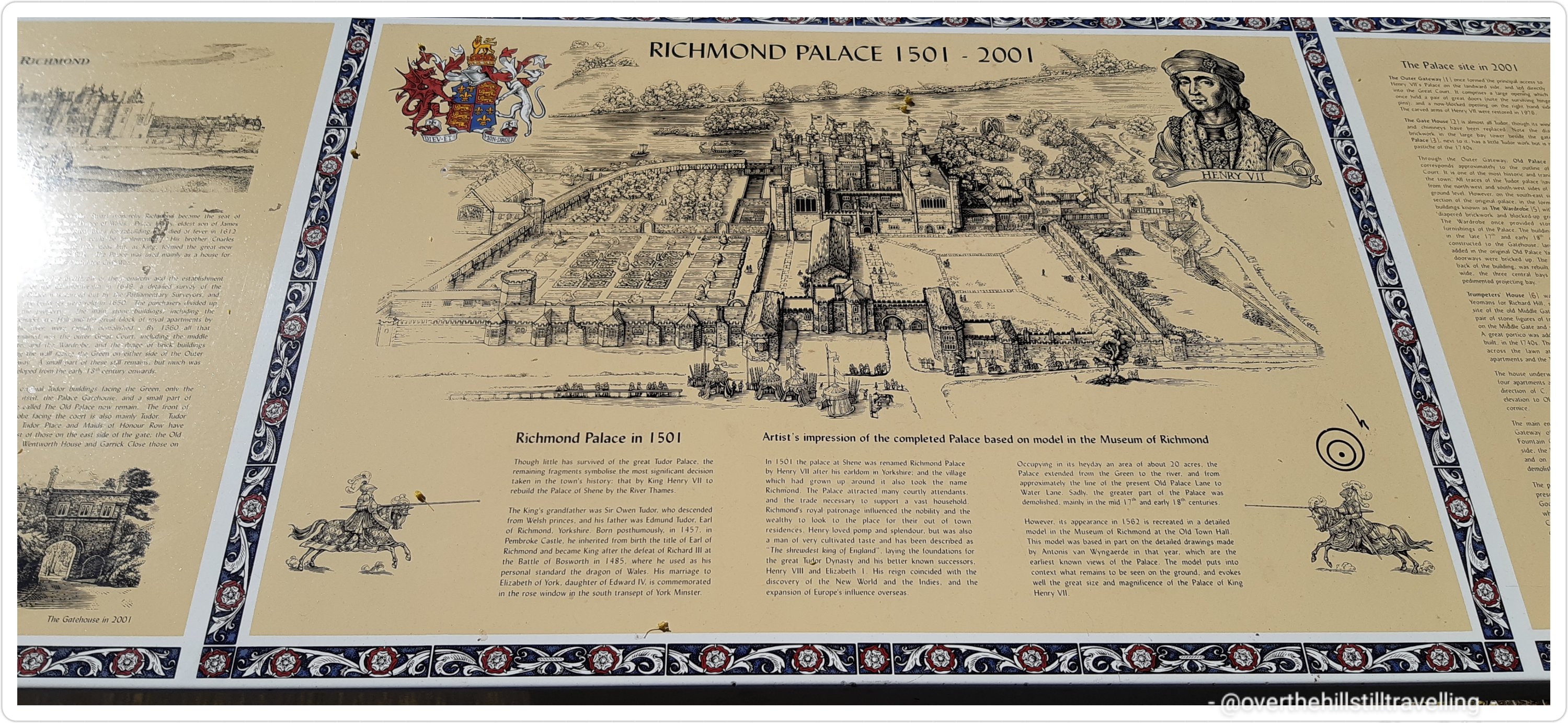 Richmond Palace is a fantastic place, albeit a lot smaller than it was originally, once a royal home erected about 1501 by Henry VII of England (n 1509 Henry VII died at Richmond Palace), Richmond Palace was a favourite home of Queen Elizabeth, who died there on 24 March 1603. It remained a residence of the kings and queens of England until the death of Charles I in 1649 after which it was sold and eventually fell into disrepair. Only vestigial traces survive, most notably the Gatehouse, the King’s Wardrobe, The Trumpeter’s House etc…all now private residences. It even has connections to Chaucer: In 1368 Geoffrey Chaucer served as a yeoman at Sheen. Queen Mary I, after her marriage to Phillip II of Spain, spent her honeymoon there. Richmond Palace was one of the first buildings in history to be equipped with a flushing lavatory, invented by Elizabeth I’s godson, Sir John Harington. There is so much history attached to the palace and I can’t possibly list it all, so I’ve added a link to wikipedia in case you’re interested to read more than just the snippets I’ve included above.
