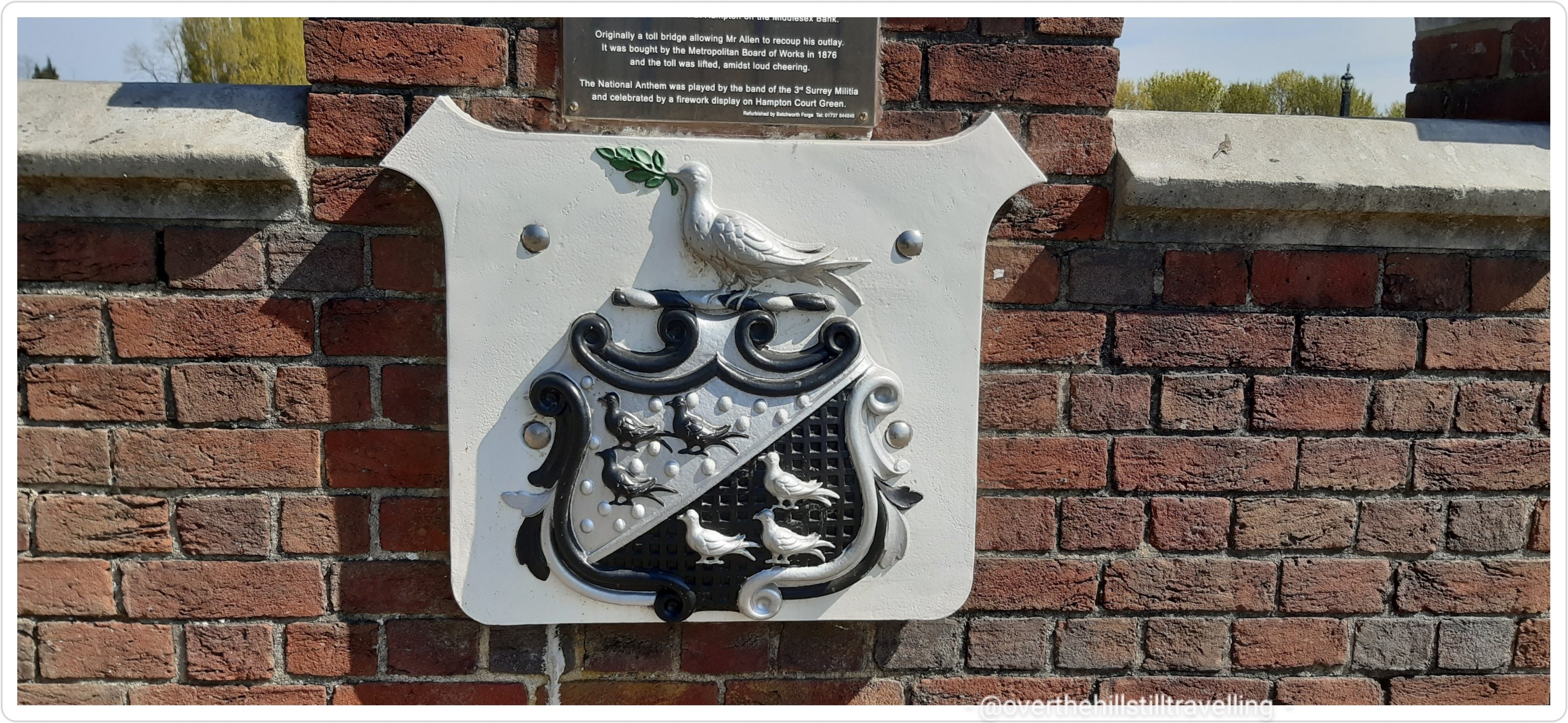 Now in East Molesey on the south bank of the Thames, after my tea and yum yums, I set off into the wild blue yonder…what will I find? First off some photos of the area, and a brief history…Hampton Court Bridge was opened in 1866 at the expense of a local man who lived in the area, Thomas Newland Allen (his coat of arms adorns the bridge). Originally a toll bridge, allowing Mr Allen to recoup his outlay, it was bought by the Metropolitan Board of Works in 1876, and the toll was lifted…I believe the locals were pleased – the National Anthem was played by the band of the 3rd Surrey Militia and there was a firework display!! I can’t imagine them doing that today!!